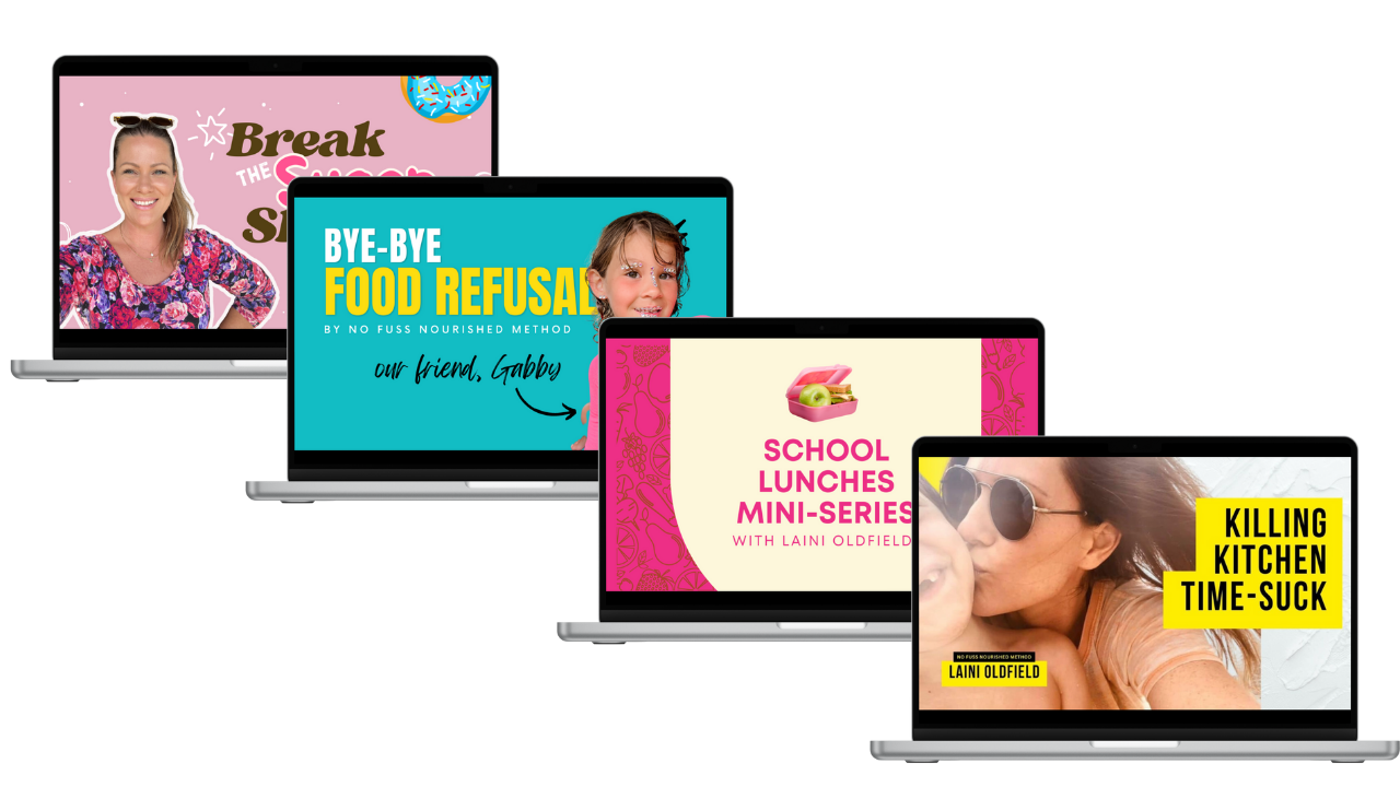 This is a digital product bundle. You’ll receive access to Bye-Bye Food Refusal and the School Lunches Mini-Series immediately after purchase. Break the Sugar Shackles and Killing the Kitchen Time-Suck will be available from Friday 6th December.